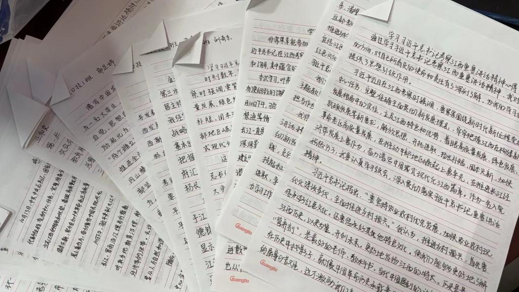 课上,叶燕平老师沿着习近平总书记考察江西的足迹,讲述总书记对革命老区的深情厚爱和无限牵挂、对江西发展的高度重视和殷切期望、对中国式现代化发展的坚定信心和决心,最后寄语同学们勿忘入党初心、争做有为青年。同学们深入学习习近平总书记重要讲话精神,课后集中书写学习习近平总书记考察江西时重要讲话精神的心得体会。