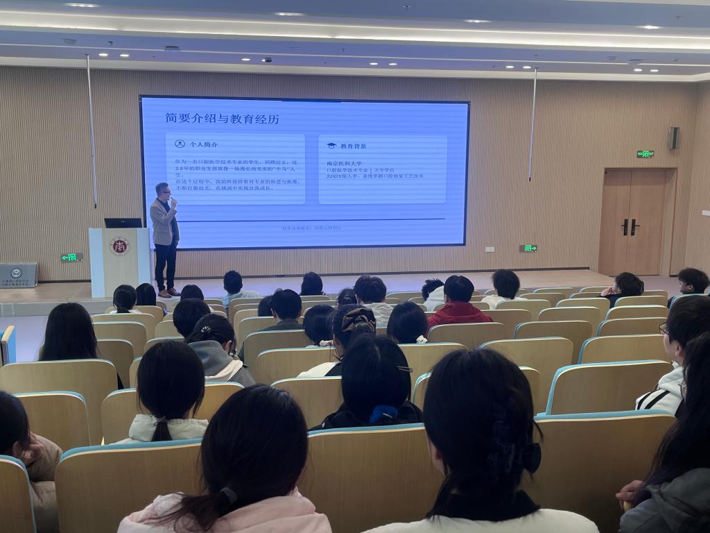 上海山八齿材有限公司总经理仲健还为口腔医学技术学生就职业规划及专业发展前景举办讲座,全体口腔医学技术专业师生到场聆听。仲健结合企业用人标准,解析行业发展趋势与多元职业路径,鼓励学子夯实专业基础、锤炼实践本领,主动对接企业需求。