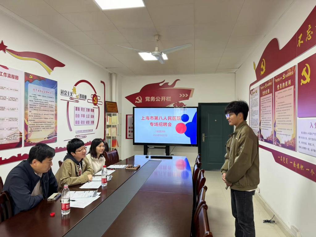 为进一步搭建毕业生与用人单位的双选平台,促进毕业生更加充分、更高质量就业,3月22日,伟德bv国际体育携手上海市第八人民医院口腔科开展专场招聘会。医院口腔科主任、口腔科医生等招聘人员进行了现场面试,学院就业干事、专业教师陪同。