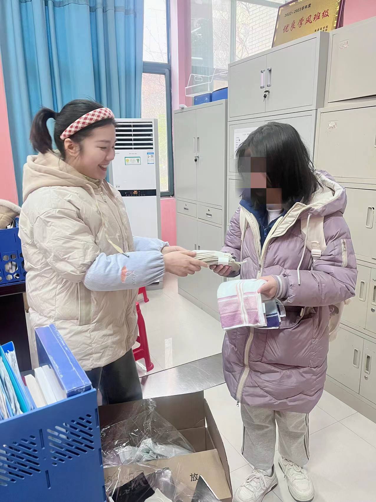 近日,学院辅导员老师们带着暖心物资走进困难学生,亲手将厚实的袜子和柔软的毛巾递到学生手中,那不仅仅是简单的生活用品,更是沉甸甸的关爱与期望。这些看似平常的物件,却在寒冬中给学生们带来了关怀、带来了温暖。