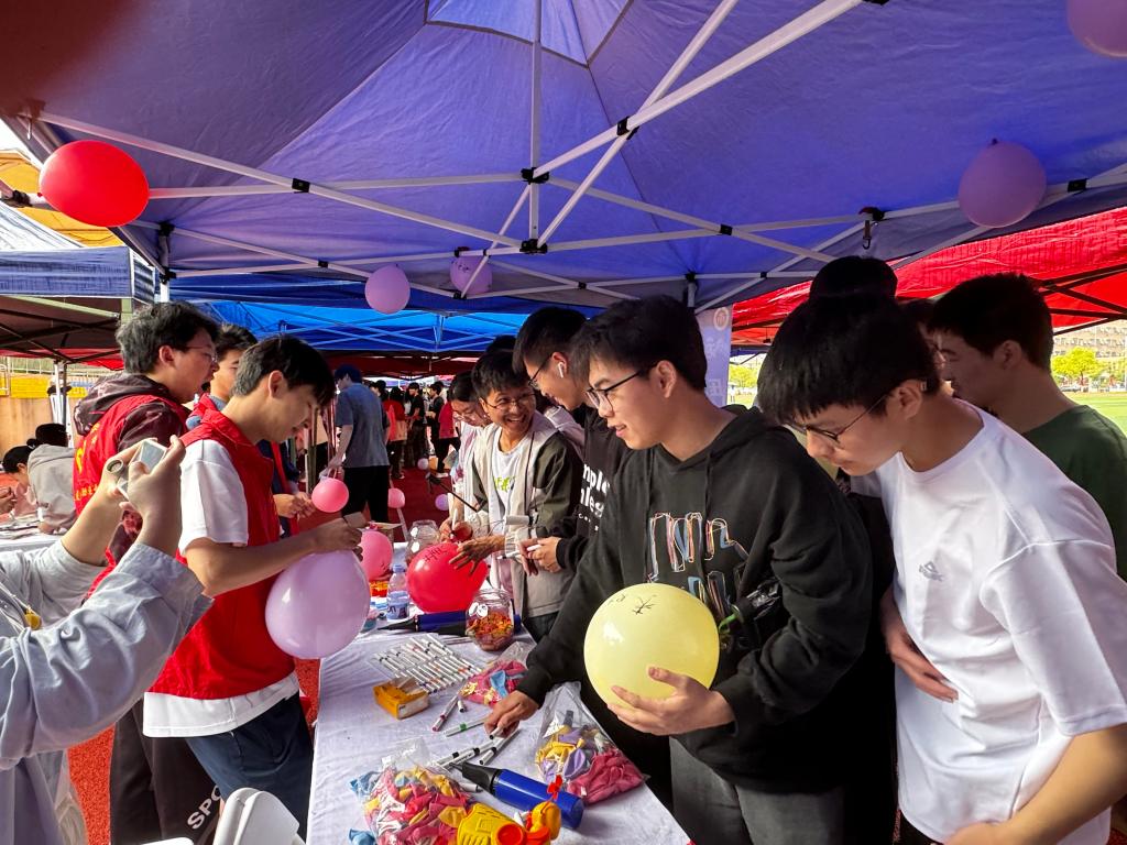 在“美食游园会”之“泡泡大作战”环节,同学们用泡泡糖吹出一个个晶莹剔透的泡泡,为同学们带来了轻松愉悦的心理健康体验。