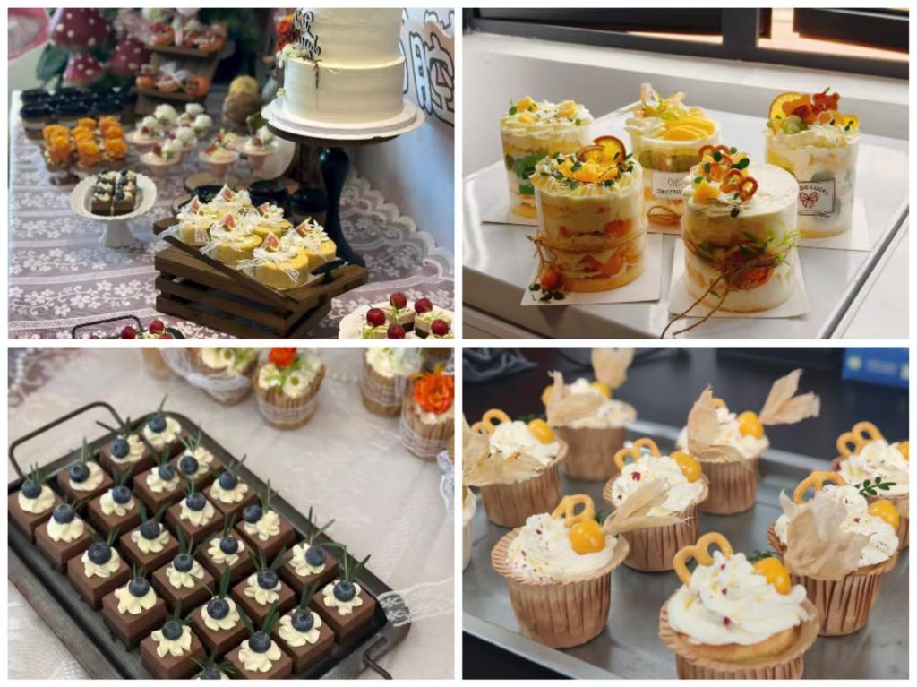 活动包括主题蛋糕、口味杯子蛋糕、奶油布丁与饮品制作、翻糖饼干、甜甜圈等四期教学与一期成果展示。通过四期实践教学与一期成果展示,同学们在面团发酵、奶油塑形的过程中,锤炼劳动技能、涵养团队精神、融合专业认知,为校园文化注入实践活力。