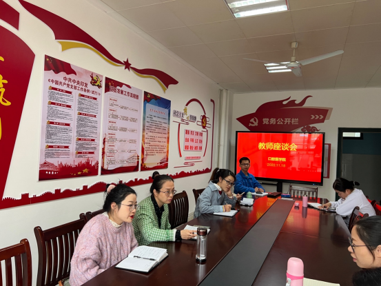 本次座谈会主要围绕教学管理、教务方法、学生学习状况、学风建设情况等方面存在的问题进行了讨论和交流。座谈会上,老师们针对理论教学、实践教学等情况进行了详细总结,同时就教学方法进行了交流;随即,口腔内科、口腔修复、口腔外科教研室主任就学生学习的主动性和积极性、师生互动情况及此次学生期中考试情况等进行总结分析,并就此提出了合理化建议和措施。