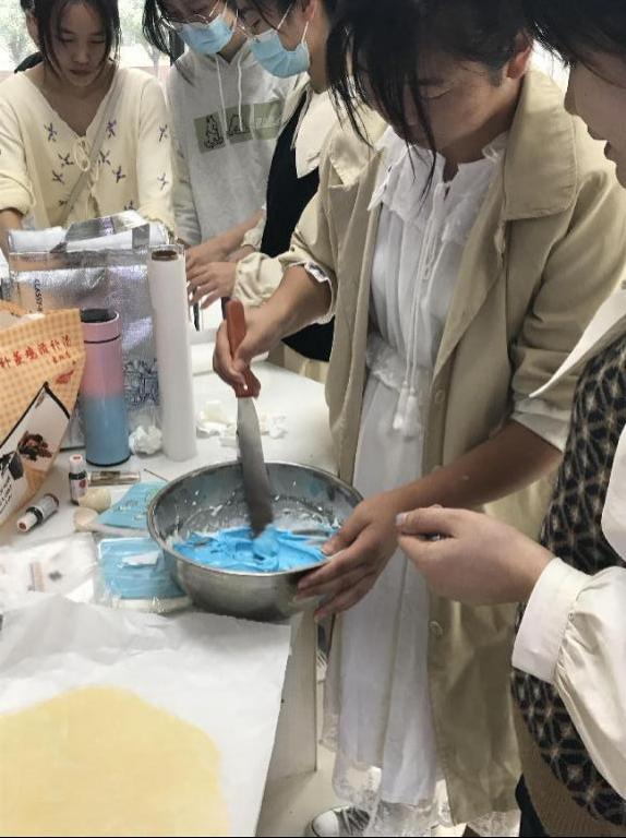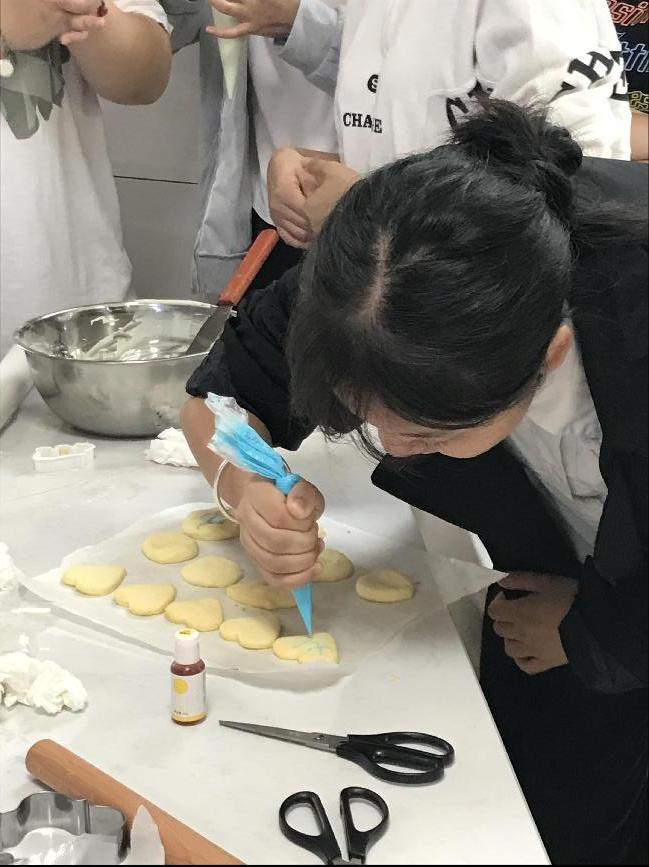 糖霜饼干是饼干中较为特殊的一种,以其细腻的外表、独特的内容夺人眼球,运用蛋清和糖粉打发出来的糖霜加上绘画手法,让饼干愈发多彩。朱玲老师为大家现场演示了饼干的制作方法,糖霜是如何做出来的,如何在饼干上用糖霜作出图案等,介绍了制作过程需要注意些什么。现场很快便呈现出一片繁忙景象。同学们全程聚精会神地倾听、观看,积极提问、互动交流,并且认真地参与到体验制作过程当中,亲手打蛋、和面、制作、放进烤箱。制作的过程是快乐的,大家跟随着老师的步骤一步步来,很快掌握了操作技巧,熟练操作起烤箱,大家还积极发挥想象力,做起了自己的原创糖霜饼干。